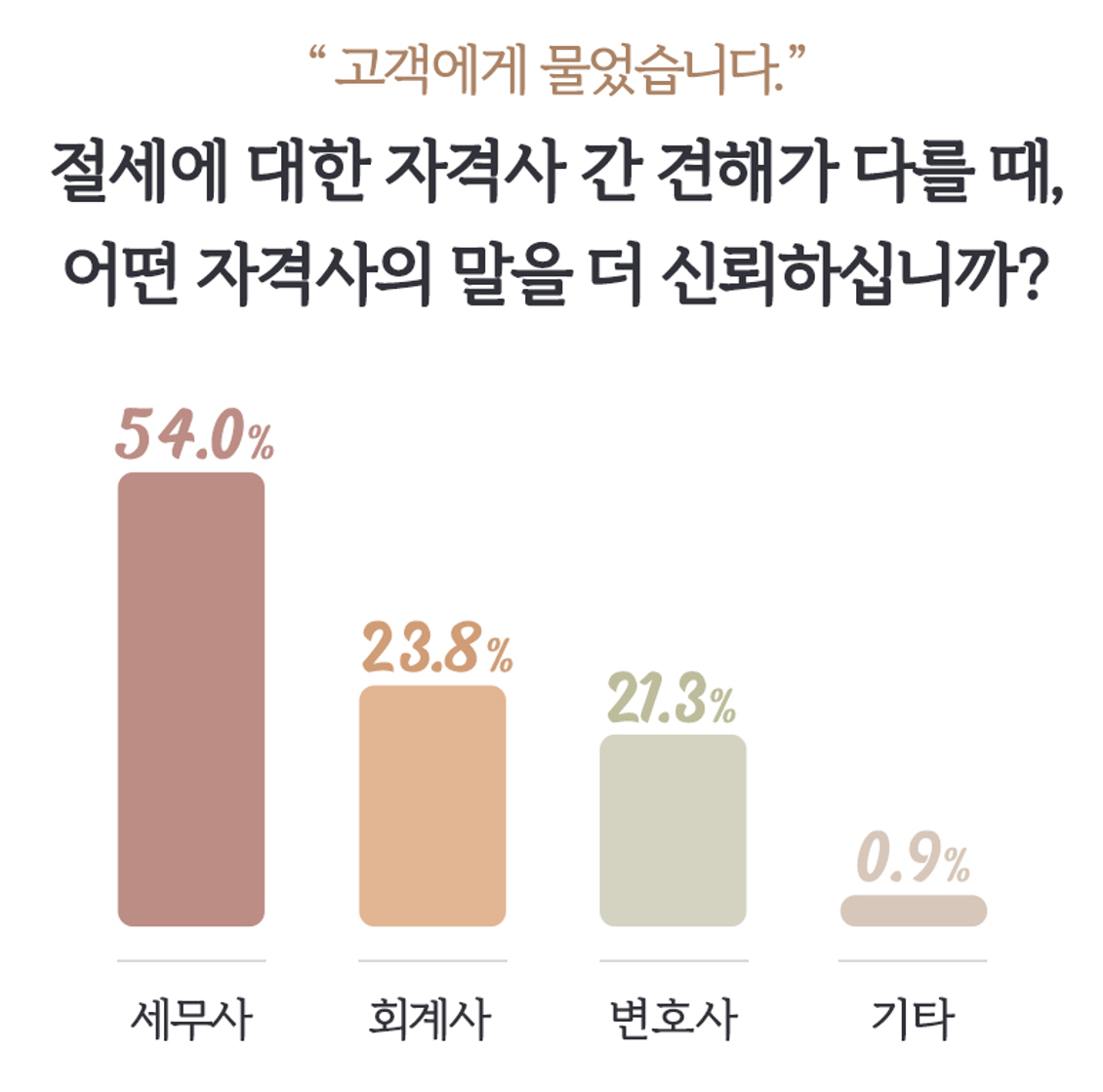 “더 낮은 비용에 동일한 세무 서비스를 제공한다면 세무사를 변경하시겠습니까?”라는 질문에 ‘아니다’라고 응답한 비율이 54.9%로 절반을 넘었습니다. “낮은 비용에 동일 서비스”라는 너무도 당연한 가정을 세웠음에도 예상과는 달리 바꾸지 않겠다고 응답한 고객이 더 많았습니다. 기장/조정료에 예민한 듯 보였던 고객은 실제로는 싼 가격보다 가치에 중점을 두는 것은 아닌지 생각해봐야 할 것입니다.