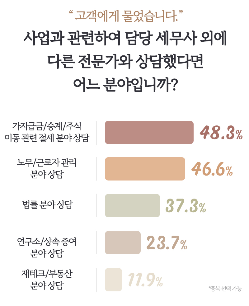 따라서 고객이 담당 세무사에게 기대하는 서비스가 무엇인지 아는 것은 중요한 일입니다. 거래처가 어떤 분야를 고민하고 있고 어떤 서비스를 원하고 있는지 알아보기 위해 다음과 같은 설문을 진행했습니다.