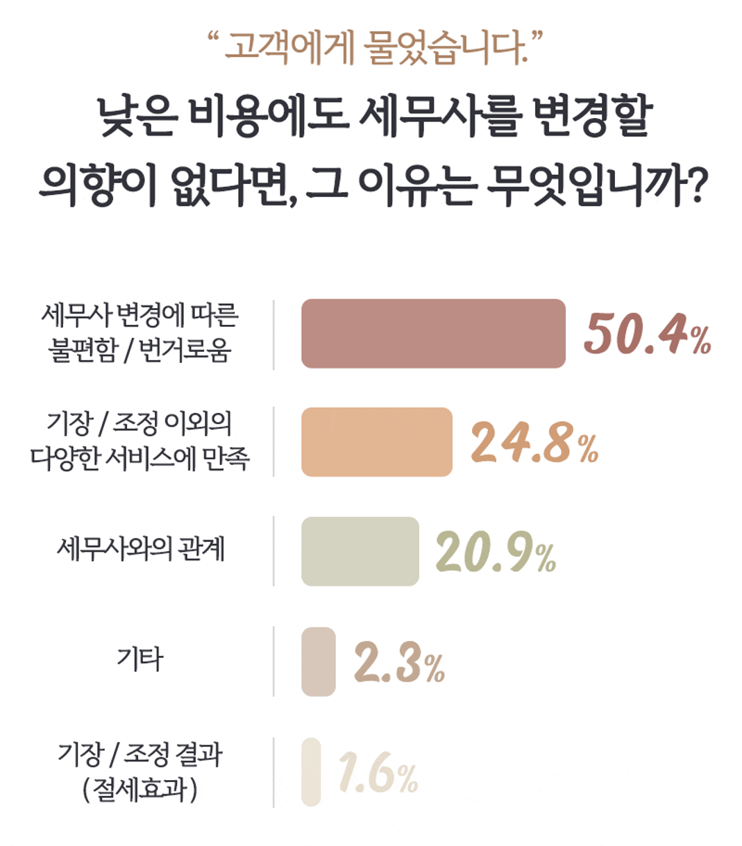 허무하게도 ‘세무사 변경에 따른 불편함/번거로움’이 응답률 1위를 차지했습니다. 현재 담당 세무사의 주된 업무인 기장/조정이나 다양한 서비스 결과에 만족하는 것이 아니라 그저 귀찮아서 바꾸지 않겠다는 것으로 해석할 수 있습니다.